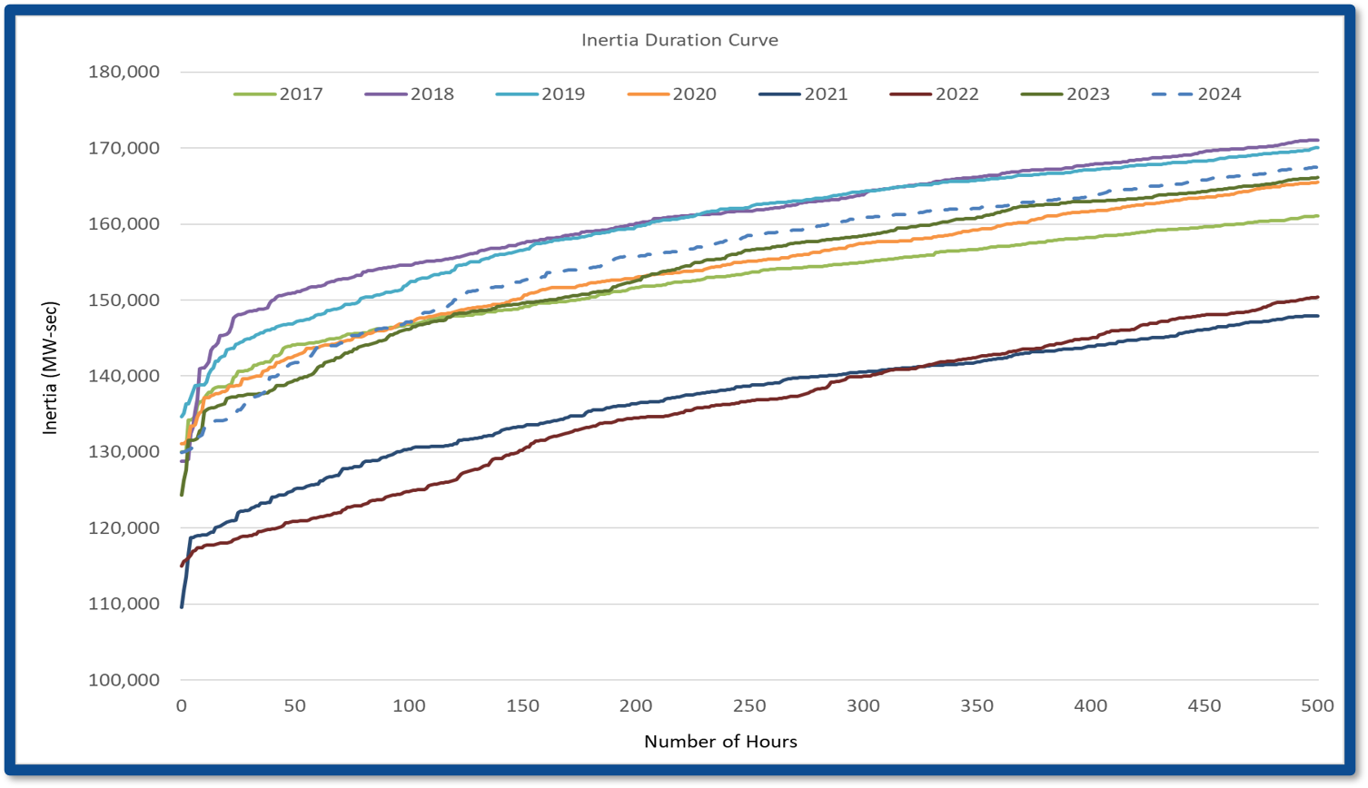 Non-synchronous generation such as wind and solar power do not supply inertia. The chart below shows the Texas Interconnection’s inertia levels over the past eight years. Periods with higher levels of renewable generation and low demand produce the lowest levels of inertia (left side of curves). Too low a level of inertia might lead to an inability to arrest a frequency decline following credible disturbances. The Electric Reliability Council of Texas (ERCOT) has determined a critical minimum level of inertia that operators track in real-time. While today’s margins are above the critical level necessary to provide secure operations, continued rapid integration of renewables could lead to inadequate inertia when synchronous generation is not on-line.